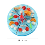 Šest dílků dortu spojených suchým zipem děti snadno „ukrojí“ plastovým nožem a znovu spojí. Volně kombinovatelné dekorace – ovoce, svíčky, medvídek či sušenky – zvou k nekonečné kreativní hře. Díky kompaktnímu průměru 14 cm se dort pohodlně drží i nejmenším.