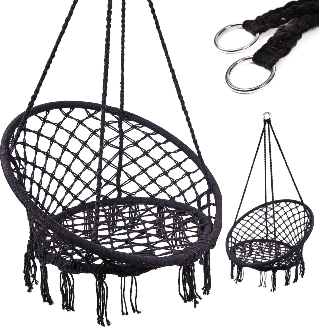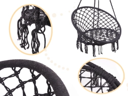 Vytvořte si vlastní relax zónu – závěsné „bocianí hnízdo“ je skvělé pro odpočinek dospělých i hry dětí. Nadčasový design v černé barvě se snadno sladí s jakýmkoli interiérem i exteriérem. Pevná lana se speciálním spltem a kovový stelaž zajišťují stabilitu a bezpečnost při houpání.