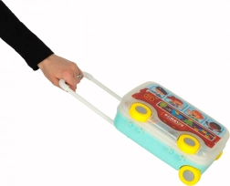 Kufřík slouží jako úložiště i pracovní plocha s děrovanou deskou. Díky kolečkům a výsuvnému madlu je ideální na cesty.