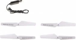 V balení najdete dron, vysílač 2,4 GHz, USB nabíječku a náhradní vrtule s chrániči pro bezpečnější létání.