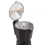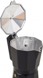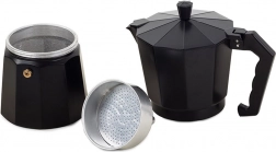 Tradiční moka konvička v moderním černém provedení spojuje nadčasový design s praktickými funkcemi pro dokonalé domácí espresso. Tělo z hliníku je lehké, skvěle vede teplo a zajistí rychlou přípravu vaší oblíbené kávy přibližně do 5 minut.