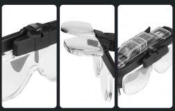 Čelová lupa s konstrukcí ve stylu brýlí uvolní ruce a zajistí stabilní pohled na detail. Tři vyměnitelné čočky 1,5x / 2x / 2,5x můžete kombinovat do vyšších zvětšení 3,5x / 4,0x / 4,5x, takže si snadno přizpůsobíte výkon aktuálnímu úkolu. Dvojice výkonných LED diod s nastavitelným směrem svitu rovnoměrně prosvětlí pracovní plochu.