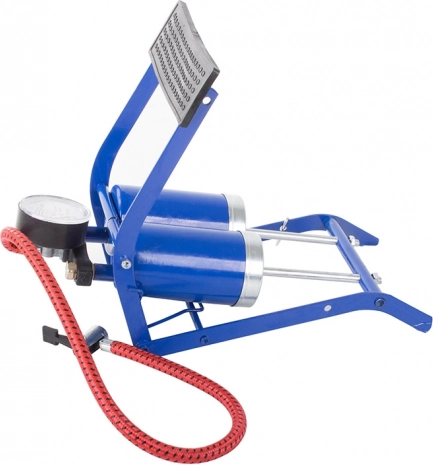 Kompaktní a spolehlivá nožní pumpa s dvojitým pístem pro rychlé a pohodlné huštění pneumatik aut, motocyklů a kol i míčů a matrací. Nabízí maximální tlak 100 PSI / 7 bar, přehledný manometr, odolnou konstrukci a protiskluzový gumový pedál pro bezpečné ovládání. Praktický zámek proti samovolnému otevření zajišťuje snadné přenášení a skladování.
