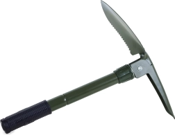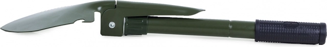 Jedna výbava pro mnoho úkolů: lopata/čepel, krumpáč, pilka a otvírák. Praktické řešení pro práci v terénu i na zahradě.