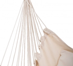 Stylové houpací křeslo v brazilském stylu promění balkon, terasu i obývací pokoj v oázu klidu. Odolná tkanina ze silné bavlny s příměsí polyesteru je příjemná na dotek, prodyšná a zároveň pevná. Široká dřevěná tyč udržuje sedák otevřený, zvyšuje stabilitu a brání kroucení.