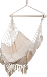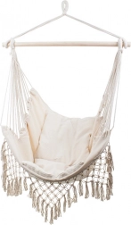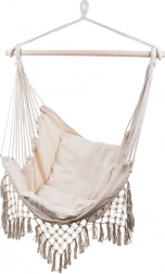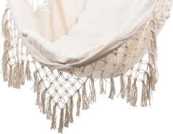 Macramé lem a dekorativní střapce podtrhují boho vzhled, který skvěle ladí s rostlinami i přírodními doplňky. Díky jednobodovému zavěšení křeslo snadno upevníte na stropní hák nebo stojan. Součástí balení jsou 2 měkké polštáře pro ještě vyšší komfort při čtení a relaxaci.