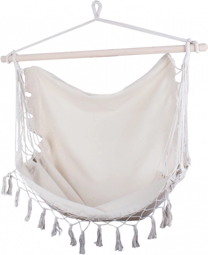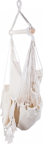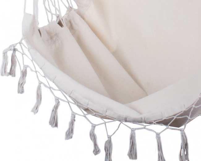 Dřevěná rozpěrná tyč udržuje křeslo otevřené, zvyšuje stabilitu a bezpečnost a brání překroucení lan. Macramé detaily a třásně dodají vašemu prostoru elegantní boho akcent. Neutrální béžová barva se snadno kombinuje s moderním, skandinávským i rustikálním zařízením.