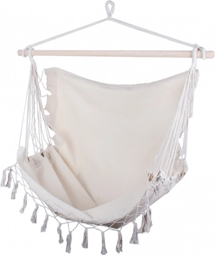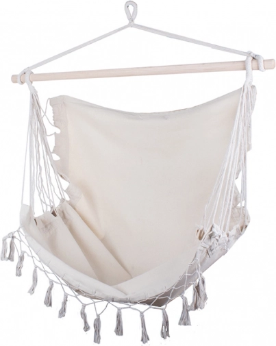 Udělejte si doma i venku svou oázu klidu. Toto brazilské závěsné křeslo v boho stylu nabízí pohodlné houpání, pevnou dřevěnou tyč pro stabilitu a univerzální béžovou barvu, která se hodí do každého interiéru i na balkon či zahradu. Díky prodyšné bavlněné směsi je sezení příjemné a křeslo se snadno zavěsí na jeden bod.