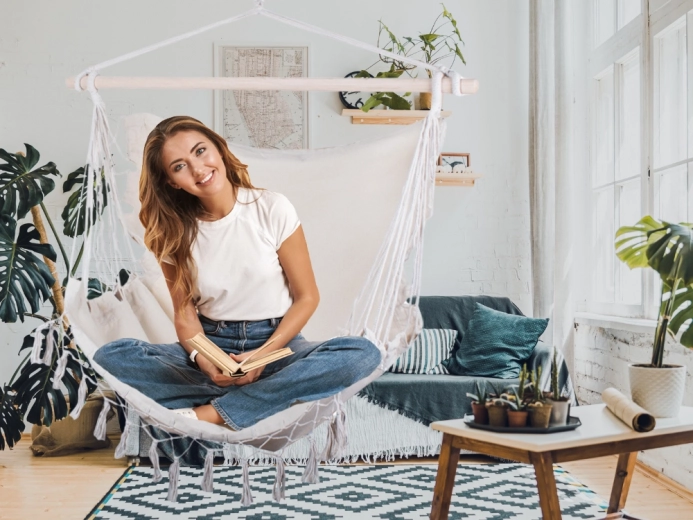Stylové závěsné křeslo typu „brazilská houpačka“ přináší relax na dosah ruky – do obývacího pokoje, ložnice, dětského pokoje, na terasu i pod strom na zahradě. Široká textilní sedací část z pevné směsi bavlny a polyesteru je komfortní, prodyšná a odolná, takže si užijete čtení, odpočinek i jemné pohupování.