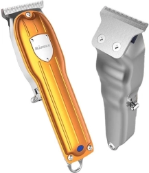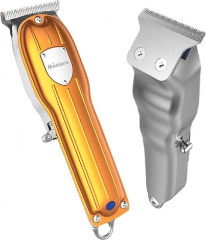 Elegantní zlatý zastřihovač MÄRSKE pro přesné úpravy vlasů a vousů. Nabízí nerezovou čepel, bezdrátový provoz, rychlé nabíjení přes USB a 3 nástavce 1–3 mm pro dokonale čisté linie i detaily.