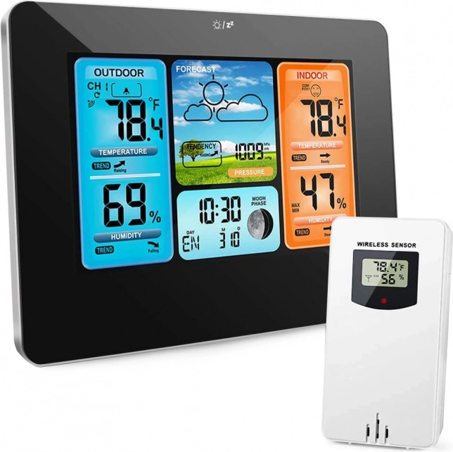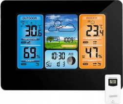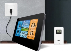 Tato digitální bezdrátová meteostanice nabízí multifunkční použití jako hodiny, budík a kalendář, navíc s 7 jazyky na výběr. Zobrazuje nejen teplotu a vlhkost ve vnitřním i vnějším prostředí, ale také fáze měsíce a poskytuje funkci předpovědi počasí.