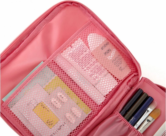 Tato praktická kosmetická taška nabízí prostornou hlavní přihrádku spolu s dvěma síťovanými kapsami. Dělící počátek je na suchý zip a umožňuje zvětšit kapacitu. Ideální pro cestování, protože díky ní zabere minimum místa.