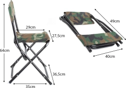 Pohodlné sezení doplňuje opěrka zad a odolná textilie v camo vzoru pro příjemné trávení času u vody nebo u ohně.
