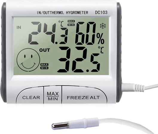 Všestranné použití: domácnosti, kanceláře, skleníky, akvária, lednice a mrazničky, ale i monitoring v garáži či dodávce. Díky dlouhé sondě (~100 cm) získáte spolehlivá data přesně tam, kde je potřebujete.