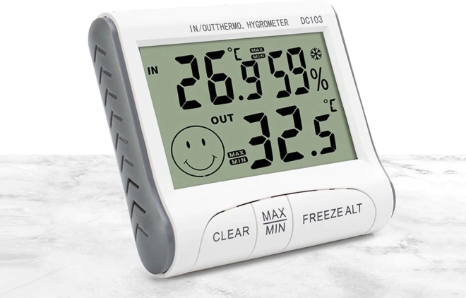 Velké číslice pro snadné čtení na dálku a smajlík, který rychle ukáže, zda jsou podmínky v místnosti příjemné.