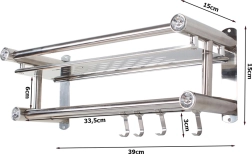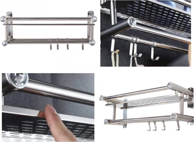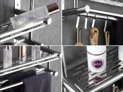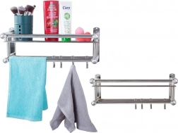 Tato nástěnná koupelnová police přináší chytré řešení pro úsporu místa i pořádek ve sprše či u umyvadla. Horní plocha pohodlně pojme kosmetiku a drobnosti, spodní část nabízí dvojitou tyč na ručníky a čtyři háčky na doplňky. Minimalistické provedení ve stříbrné barvě působí čistě a elegantně.