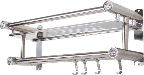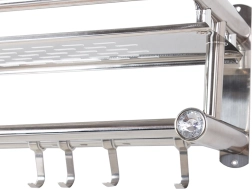 Elegantní závěsná koupelnová police ve stříbrné barvě kombinuje prostornou odkládací plochu, dvě tyče na ručníky a čtyři praktické háčky. Lehká a odolná konstrukce z hliníku je ideální pro každodenní použití a díky univerzálnímu designu zapadne do moderních i klasických interiérů.