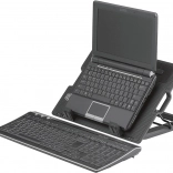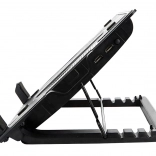Výkonná chladicí podložka s jedním velkým a tichým ventilátorem zlepšuje proudění vzduchu a zabraňuje přehřívání notebooku. Čtyři stupně nastavení sklonu (cca 20–40°) podpoří zdravé držení těla a pohodlné psaní. Robustní konstrukce s protiskluzovými prvky drží zařízení bezpečně na místě.