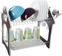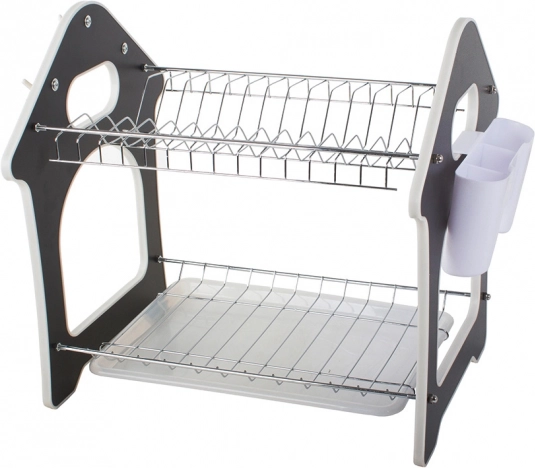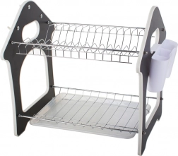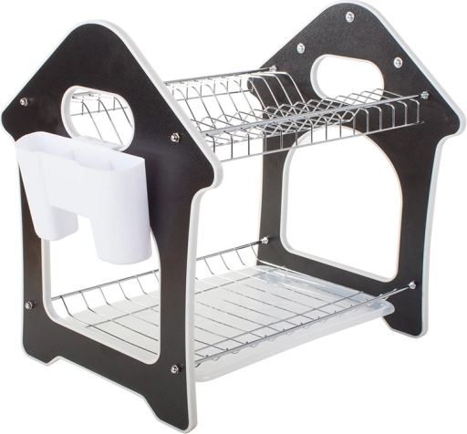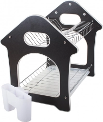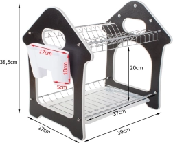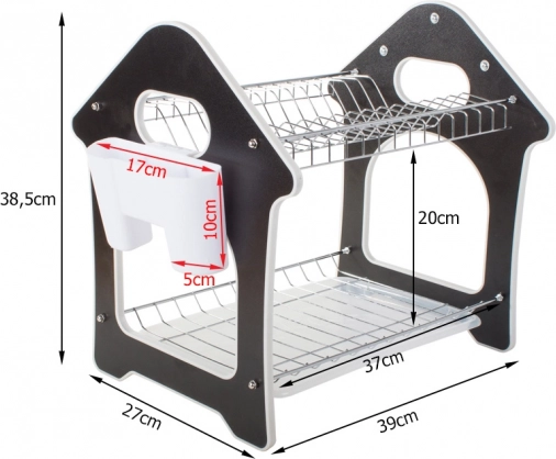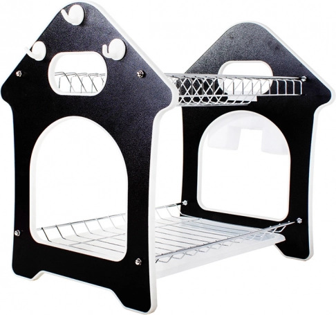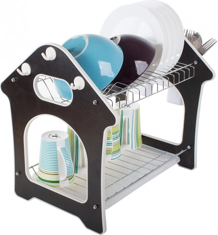 Praktický dvoupatrový odkapávač na nádobí s tácem zachytávajícím vodu, držákem na příbory a třemi háčky pro kuchyňské doplňky. Nabízí velkou kapacitu, odolnou konstrukci z kovu a plastu a stabilní základnu, která chrání pracovní desku před vlhkostí. Stylový design ve tvaru domečku skvěle zapadne do každé kuchyně.