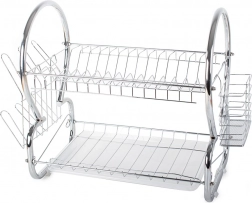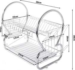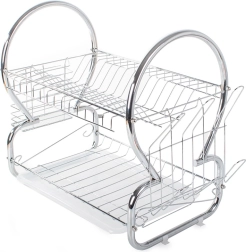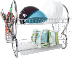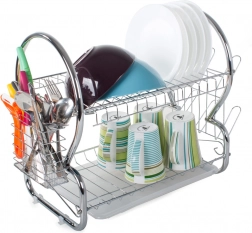 Praktický dvouúrovňový odkapávač na nádobí pro přehlednou kuchyň. Nabízí velkou kapacitu, držák na příbory a boční stojan na sklenice. Spodní plastový podnos zachytává vodu, takže pracovní deska zůstane suchá. Ideální pro talíře, misky, sklenice i hrnky.