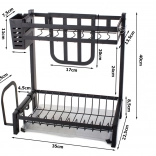 Dvoupatrový odkapávač na nádobí je vyroben z vysoce kvalitního kovu s práškovým nástřikem, aby vydržel vlhkost a intenzivní používání. Díky stabilní konstrukci se odkapávající voda sbírá v plastové vaničce a nepoškozuje pracovní desku.