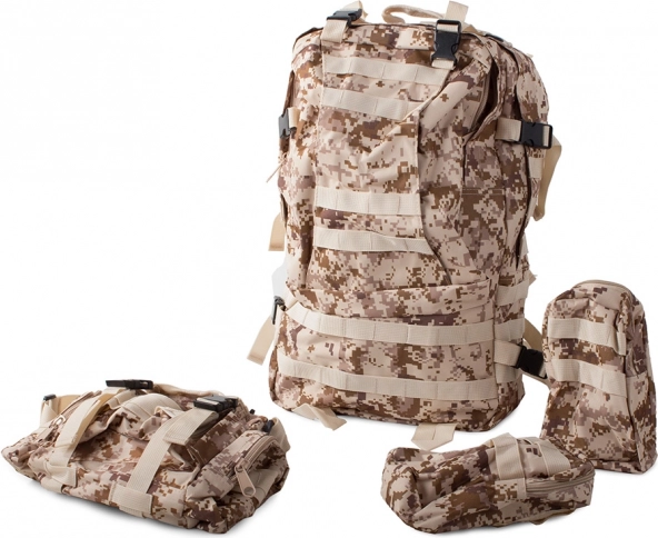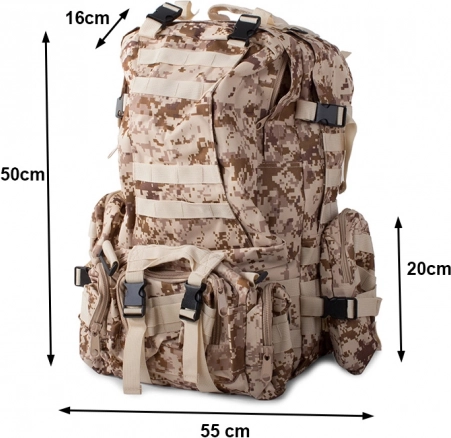 Batoh je navržen pro různé fyzické aktivity jako turistika, vojenské účely, kempování a mnohem více. Jeho ergonomický design s nastavitelnými popruhy a polstrovanými rameny zajišťuje pohodlí i při dlouhých túrách.