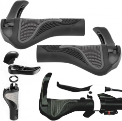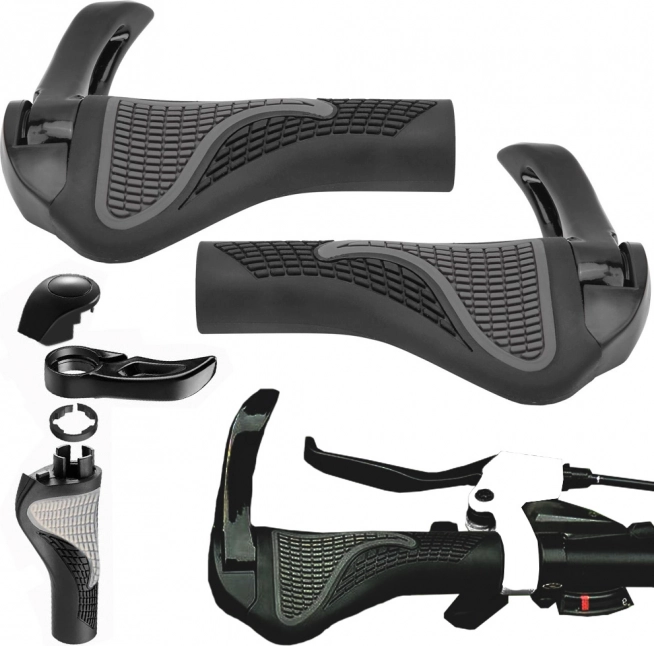 Tyto anatomicky tvarované rukojeti z protiskluzové gumy zajišťují komfort i při delších vyjížďkách. Měkký povrch tlumí nárazy a pomáhá udržet zápěstí ve správné poloze, zatímco integrované hliníkové rohy umožňují změnu úchopu a snižují únavu rukou.