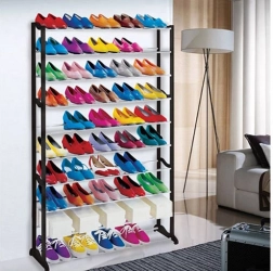 Konstrukce kombinuje plastové sloupky a hliníkové trubky pro nízkou hmotnost, stabilitu a rychlou montáž. Nastavitelný počet úrovní 1–10 a rozteč polic 14 cm vám umožní přizpůsobit stojan teniskám, lodičkám i dětské obuvi.