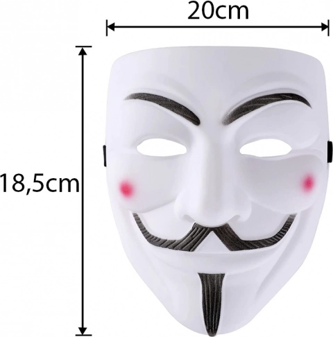 Objevte symbol anonymity a vzpoury s maskou Guy Fawkes, známou z filmu V JAKO VENDETA a spojenou s hnutím ANONYMOUS. Věrné detaily – výrazné obočí, knír a bradka – vynikají na bílém podkladu s jemným růžovým nádechem na líčkách. Maska je z lehkého plastu a díky elastickému pásku se pohodlně nosí.