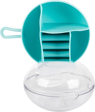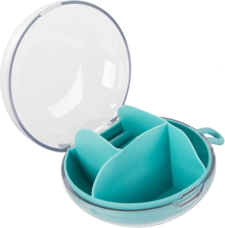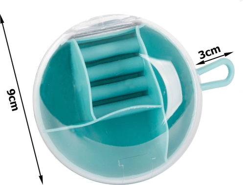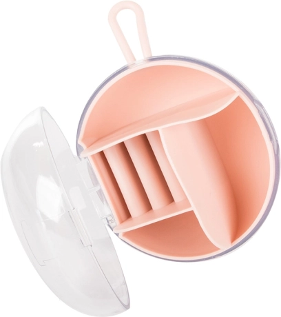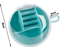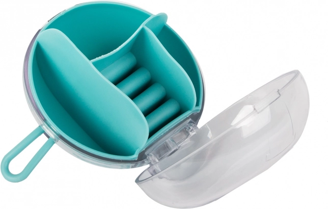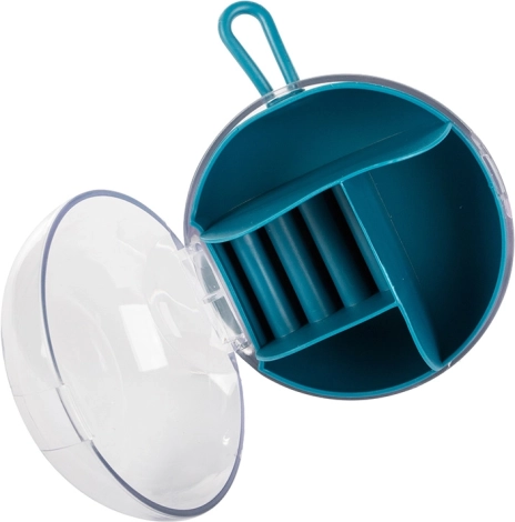 Díky vyjímatelnému středovému organizéru můžete část přihrádek používat i samostatně. Kompaktní rozměry průměr 9 cm a výška 6 cm z něj dělají ideální volbu do kabelky, kufru i na toaletní stolek. Dostupné barvy: růžová, tmavě modrá, zelená.