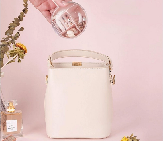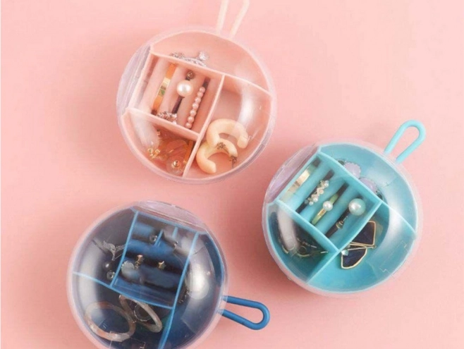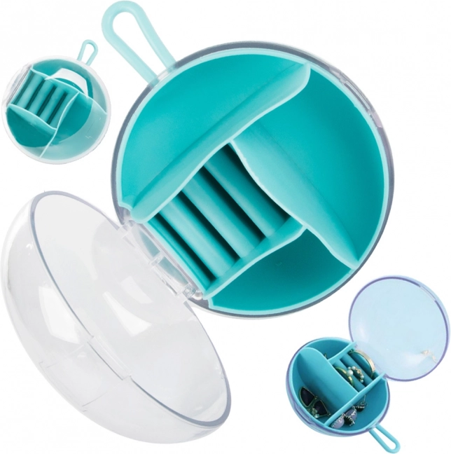 Kompaktní cestovní šperkovnice s kulatým tvarem a promyšleným členěním pro prsteny, náušnice i řetízky. Díky průhlednému víku máte okamžitý přehled, vyjímatelný střed zjednodušuje organizaci a poutko usnadňuje přenášení. Snadno se čistí a skvěle se hodí na cesty i domů.