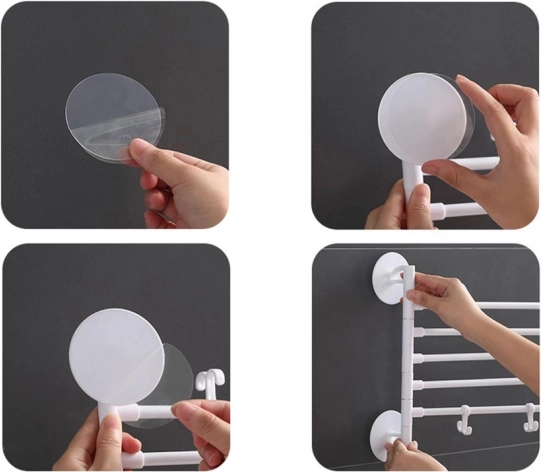 Udržte v koupelně pořádek a šetřete místo s tímto praktickým věšákem na ručníky. Má 4 otočná ramena z kovu, která lze nastavovat nezávisle, a odolnou plastovou základnu. Díky bezvrtacímu lepenému uchycení ho snadno připevníte na obklady. Elegantní bílý design se hodí do každé koupelny.