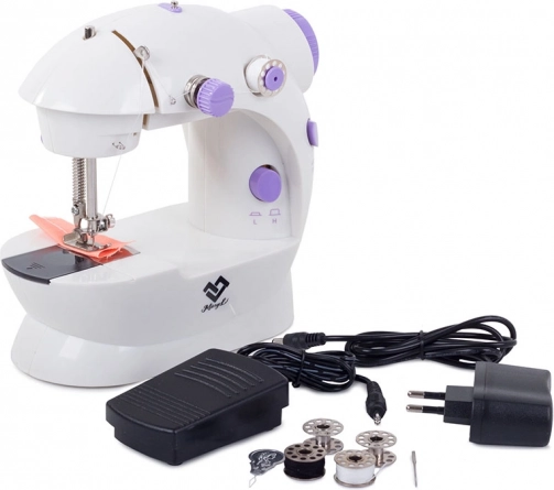- Mini šicí stroj, 4 × cívka s nití (3× bílá, 1× černá), 2 × prázdná cívka, náhradní jehla, navlékač jehly, napájecí zdroj 230 V, nožní pedál, originální balení