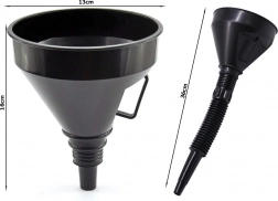 Velký trychtýř s filtrem je vyroben z plastových materiálů odolných vůči chemikáliím, což zaručuje dlouhou životnost a spolehlivost. Díky dvoudílné konstrukci lze použít samostatně nebo v kombinaci s flexibilním nástavcem, který usnadňuje přesné nalévání.