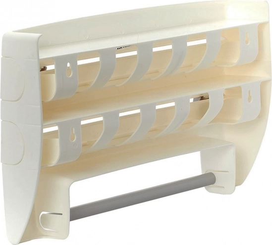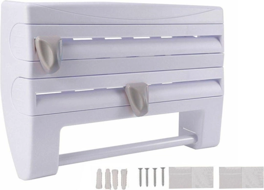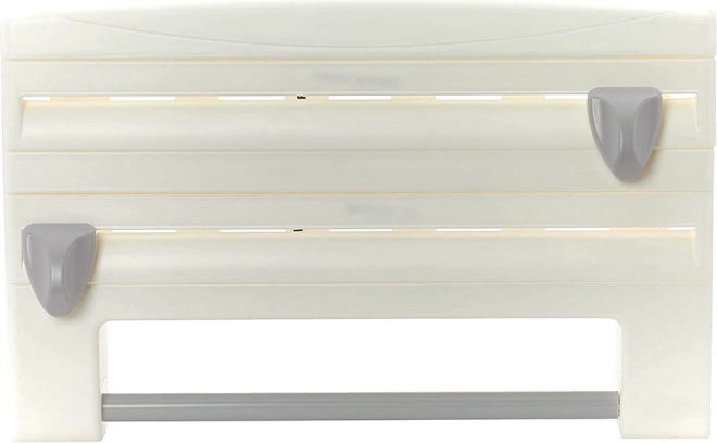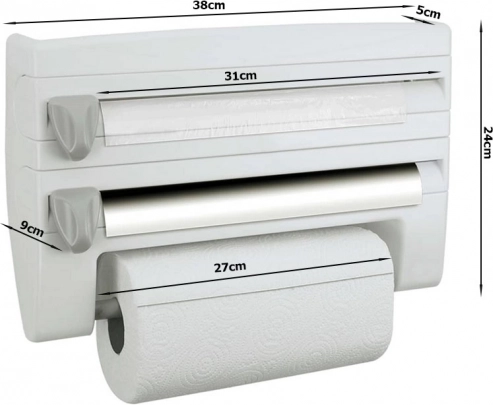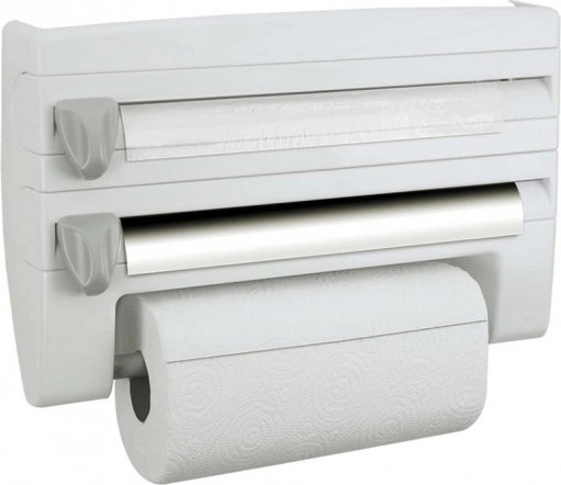 Udělejte si v kuchyni pořádek s praktickým nástěnným organizérem 4 v 1, který pojme alobal, potravinovou fólii i papírové utěrky a navíc nabízí horní polici na koření a drobnosti. Díky precizním skrytým čepelím odtrhnete fólie rychle a bez zubatých okrajů, montáž je snadná a vhodná pro standardní role do 31/27 cm.