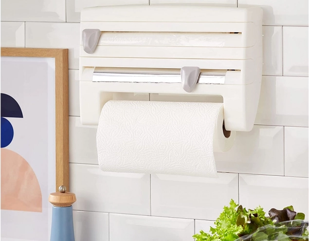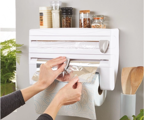 Dva zásobníky na fólie, držák na papírové utěrky a horní police na koření či drobnosti udrží kuchyňské nezbytnosti na jednom místě a ušetří vám místo na pracovní desce.