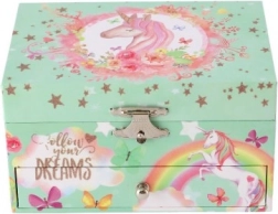 Tato stylová hrací šperkovnice s jednorožcem je ideální pro ukládání prstýnků, náušnic a drobných tajemství. Po otevření víka se zrcátkem se po natažení klíčku roztočí bílý-růžový jednorožec a zazní jemná hudba. Vnitřek nabízí členěný prostor na šperky, zatímco spodní zásuvka pojme další cennosti.