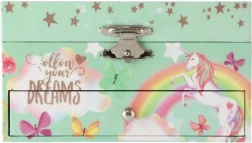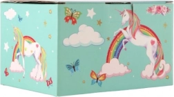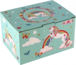 Kouzelná hrací šperkovnice s motivem jednorožce v pastelově zelené barvě potěší každou malou parádnici. Po natažení klíčku se uvnitř roztáčí figurka jednorožce a zazní jemná melodie. Uvnitř najdete zrcátko, přehledné přihrádky a praktickou zásuvku na drobné poklady. Odolná kartonová konstrukce, kovové prvky a půvabné ilustrace duhy, hvězdiček a motýlků skvěle doladí dětský pokoj.