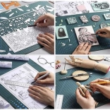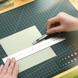 Oboustranné měřicí mřížky, úhlové a kruhové vodicí linie zrychlí vyrovnání materiálu a zlepší přesnost. Protiskluzový materiál drží pevně na místě, takže můžete bezpečně pracovat s řezačem, skalpelem i rotační řezačkou.